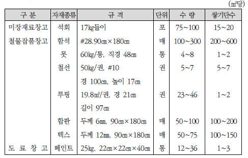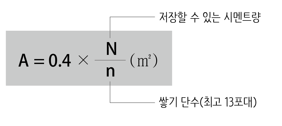 표준품셈에서는 시멘트 창고의 필요 면적을 다음 식으로 산출하도록 규정하고 있습니다.
