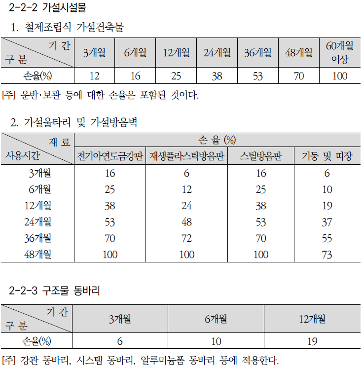 참고로 표준품셈에서 가설시설물에 적용하는 손율을 다음과 같습니다.