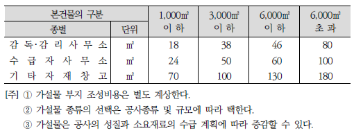 가설건물에 적용해야 할 절대적인 적산기준은 없습니다. 표준품셈에 현장사무소 등의 규모를 제시하고 있기는 하지만 절대적인 기준은 아니기 때문에 현장 상황에 맞게 적용할 수 있습니다. 현장에 현장사무소 등을 설치할 수 없는 경우는 주변의 건물을 임대해서 사용할 수도 있습니다.