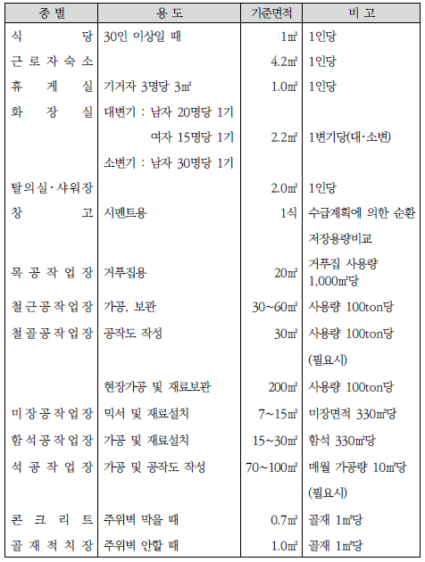 표준품셈에서 규정하고 있는 가설건물의 기준면적은 다음과 같습니다. 기억하실 필요는 없습니다.