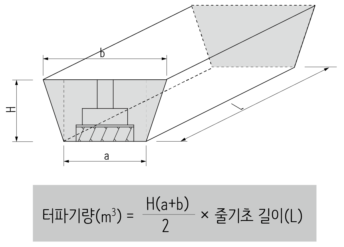 줄기초의 터파기는 줄기초의 단면적에 중심선의 연장길이를 곱해서 산출합니다.