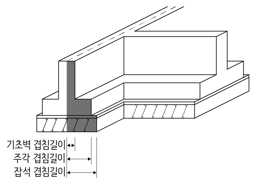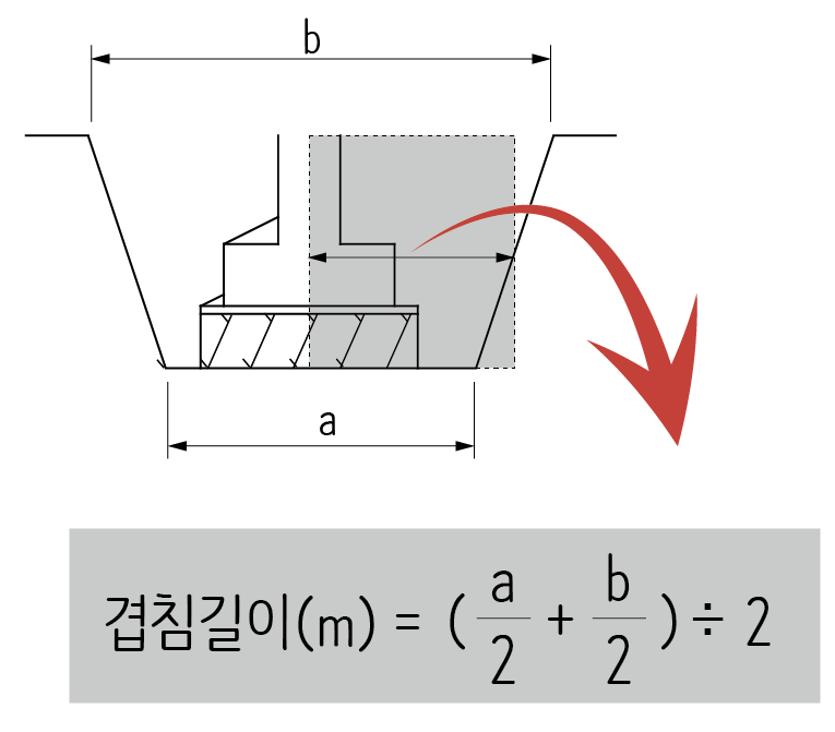 건축물의 외주부를 따라 ㅁ자형으로 둘러싸인 부분은 줄기초 길이를 산정할 때 중심선의 길이로 산정해도 무방합니다. 그렇지만 내부에 있는 줄기초, 즉 다른 줄기초와 T자형으로 만나게 되는 부위는 겹쳐지는 부위가 발생하기 때문에 겹쳐진 부분 만큼의 길이를 공제해야 합니다. 겹침길이는 다음과 같이 계산할 수 있습니다.