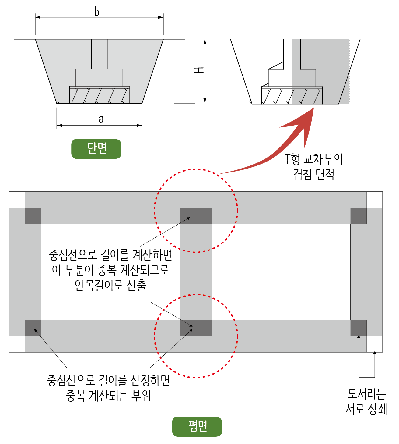 또 되메우기량을 계산할 때도 구조체 각 부분의 연장길이를 계산해야 하는데 이 때에도 T자형으로 만나는 부위는 겹침 길이만큼 공제해야 합니다.