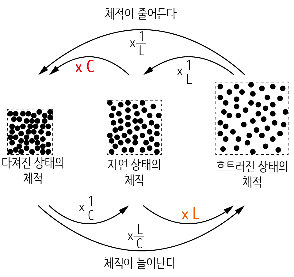 먼저, 환산계수인 L이나 C은 분모에 자연상태의 체적을 대입해서 계산하기 때문에, 자연상태를 기준으로 변하는 양을 계산하려면 그냥 L이나 C를 곱해서 계산하면 됩니다.