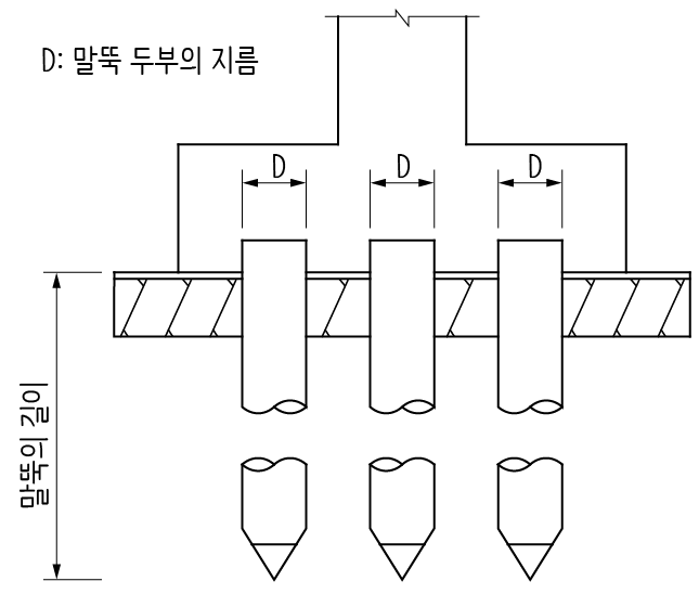 보통 현장타설 콘크리트 말뚝의 수량은 형상, 치수, 길이, 공법 등으로 분류하여 말뚝 개수를 산출합니다. 기성말뚝의 수량은 종류, 형상, 길이 등으로 분류하여 말뚝 개수를 합니다. 말뚝의 길이는 기초저면에서 말뚝 선단까지의 길이로 하, 두부정리에 의해 잘려지는 부분의 길이는 무시합니다.