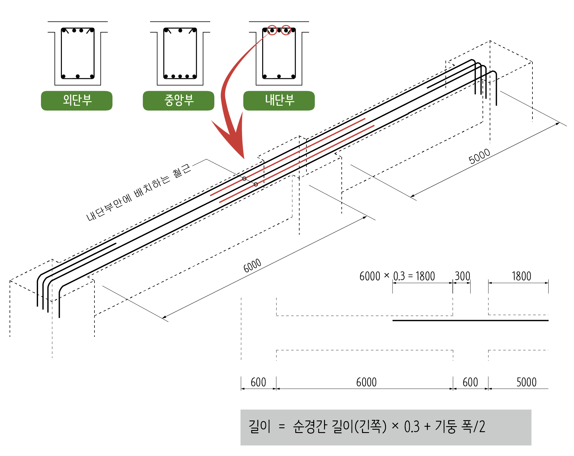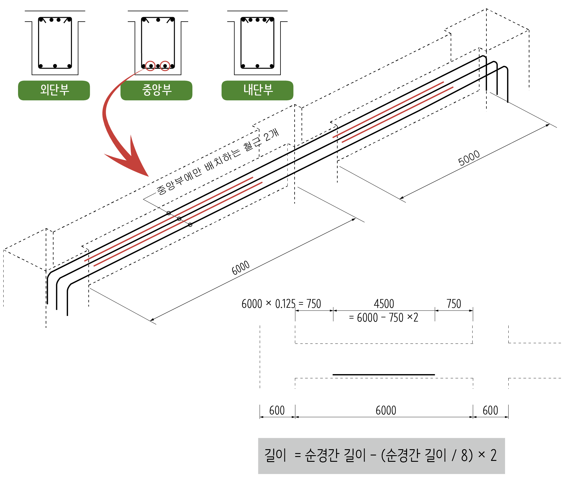 이 철근은 단부까지 배치할 필요가 없기 때문에 중앙부에서 단부까지 충분히 연장한 후 잘라줍니다. 자르는 지점은 순경간의 1/8의 위치입니다. 따라서 중앙부에만 배치하는 철근의 길이는 순경간의 길이 - (순경간 길이 × 0.125) × 2로 계산합니다.