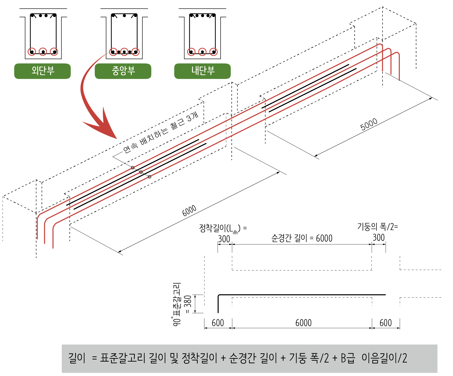 이 철근의 기본 길이는 순경간의 간격(여기서는 6000)이 될 것입니다. 그리고 양쪽 단부에서 철근을 어떻게 처리해야 할 것인지를 고려해서 길이를 더해줍니다. 왼쪽은 외단부 기둥에 접해 있기 때문에 기둥에 정착해야 합니다. 따라서 표준갈고리를 만들어 정착하는 길이를 더해 줍니다.