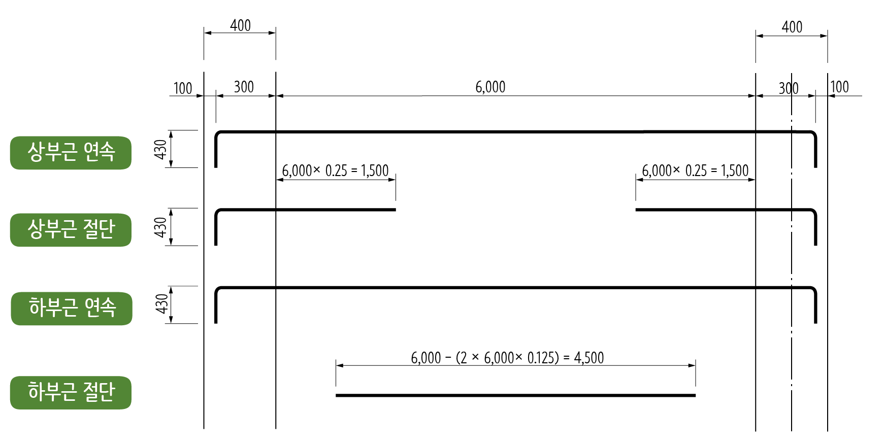 하부근 연속(D25) = (16 × 0.025 + 0.4 - 0.1) × 2(양쪽 정착) + 6 = 7.4 m × 2(개) = 14.8 m