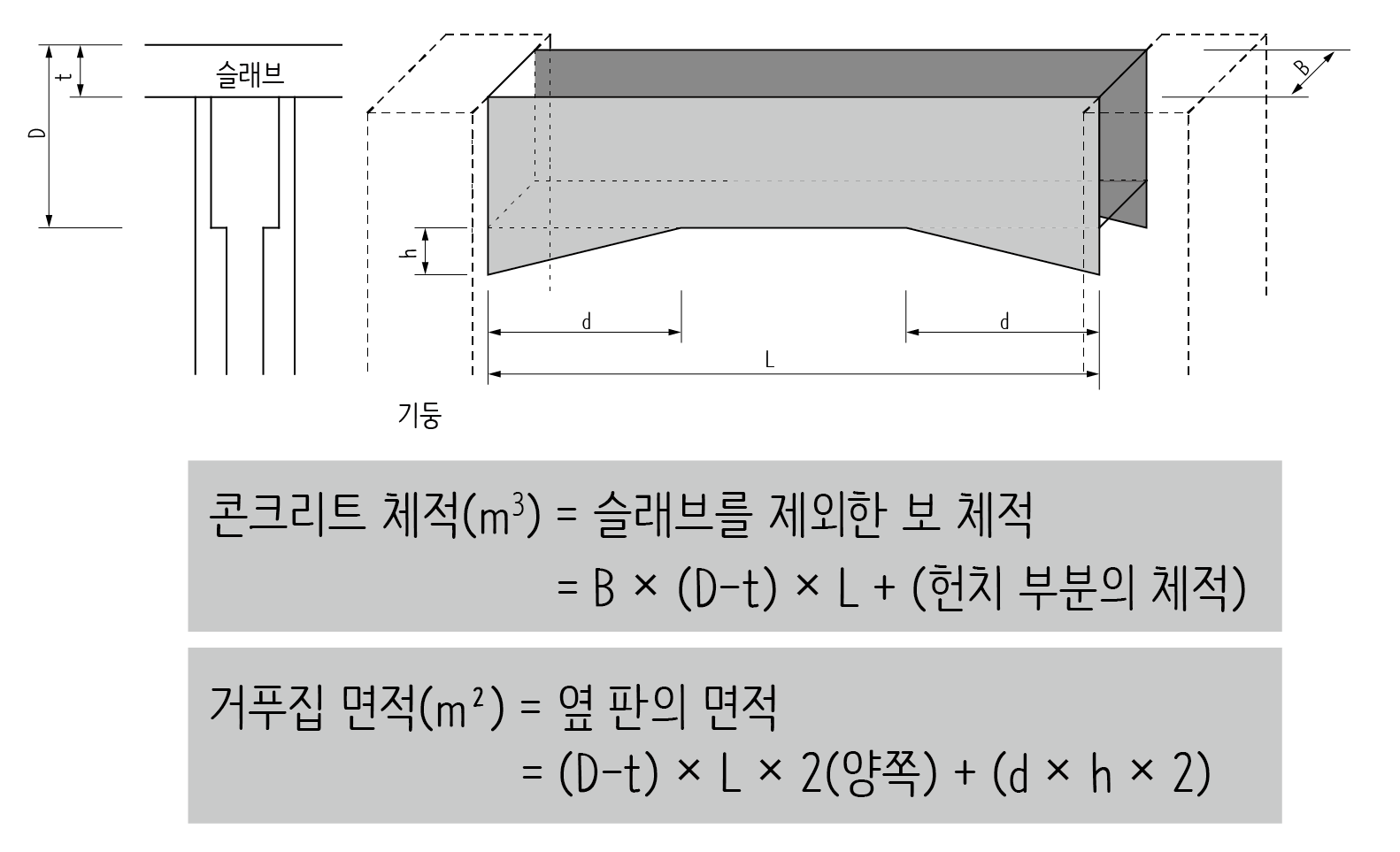 거푸집(m²) = 슬래브 두께를 제외한 보의 높이 × 순경간의 길이