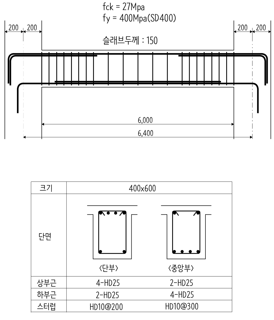 상부근 연속(D25) = (16 × 0.025 + 0.4 - 0.1) × 2(양쪽 정착) + 6 = 7.4 m × 2(개) = 14.8 m