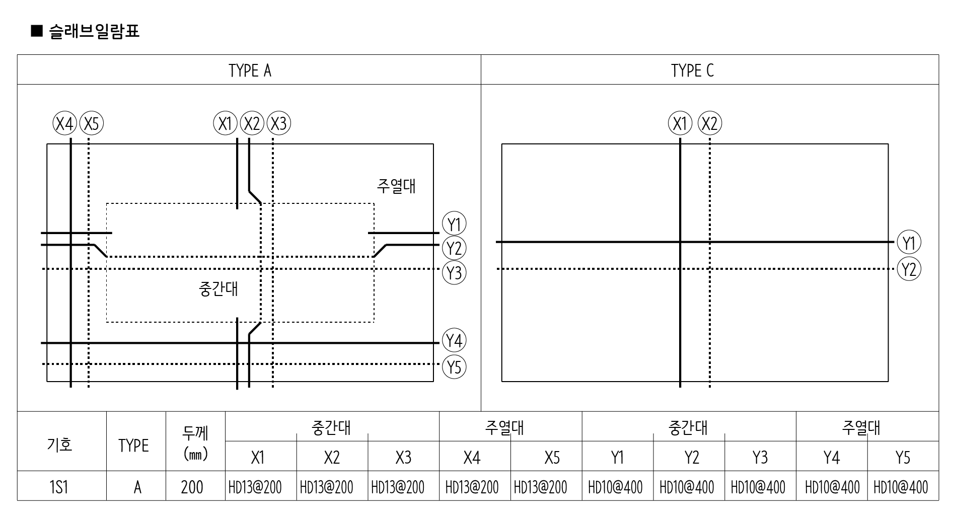 슬래브의 부재 일람표는 주로 표의 형태로 제시됩니다. 다음 일람표를 보고 살펴보겠습니다.