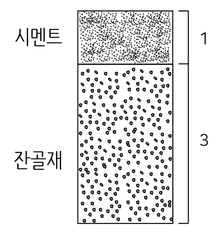 따라서 시멘트 용적(부피)은 전체 모르타르의 1/4, 모래 용적은 전체 모르타르의 3/4이 됩니다.