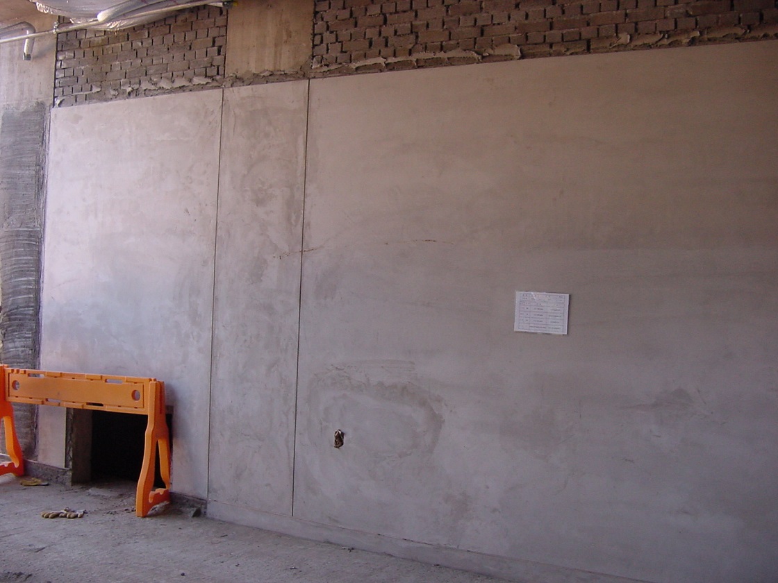 미장공사는 벽이나 천정, 바닥 등 매끄러운 표면을 형성하기 위해 시멘트 모르타르 등을 일정한 두께로 바르는 공사를 말합니다. 아래 사진을 보면 콘크리트벽돌로 쌓은 간막이벽체의 표면을 매끄럽게 만들기 위해 시멘트 모르타르로 바른 것을 볼 수 있습니다.