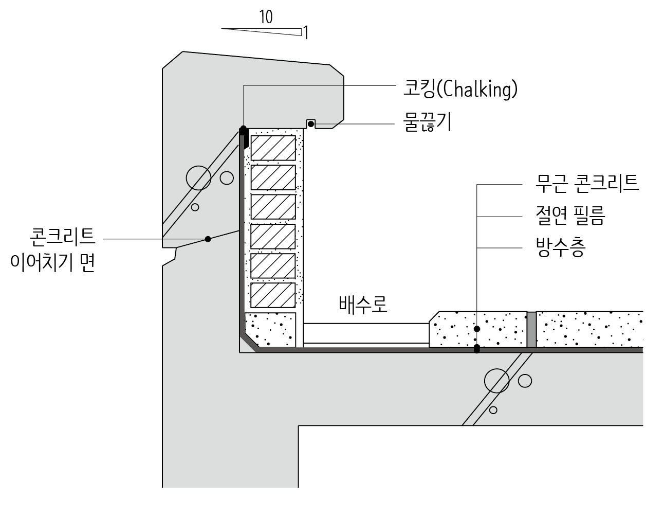 신축줄눈은 보호콘크리트를 일정한 크기로 나누기 위해 설치하는 것입니다. 옥상은 기온차가 크게 발생하기 때문에 보호콘크리트를 적절하게 나누지 않으면 균열이 발생하게 됩니다. 신축줄눈은 도면에 보고 전체의 연장길이[m]를 산출합니다.