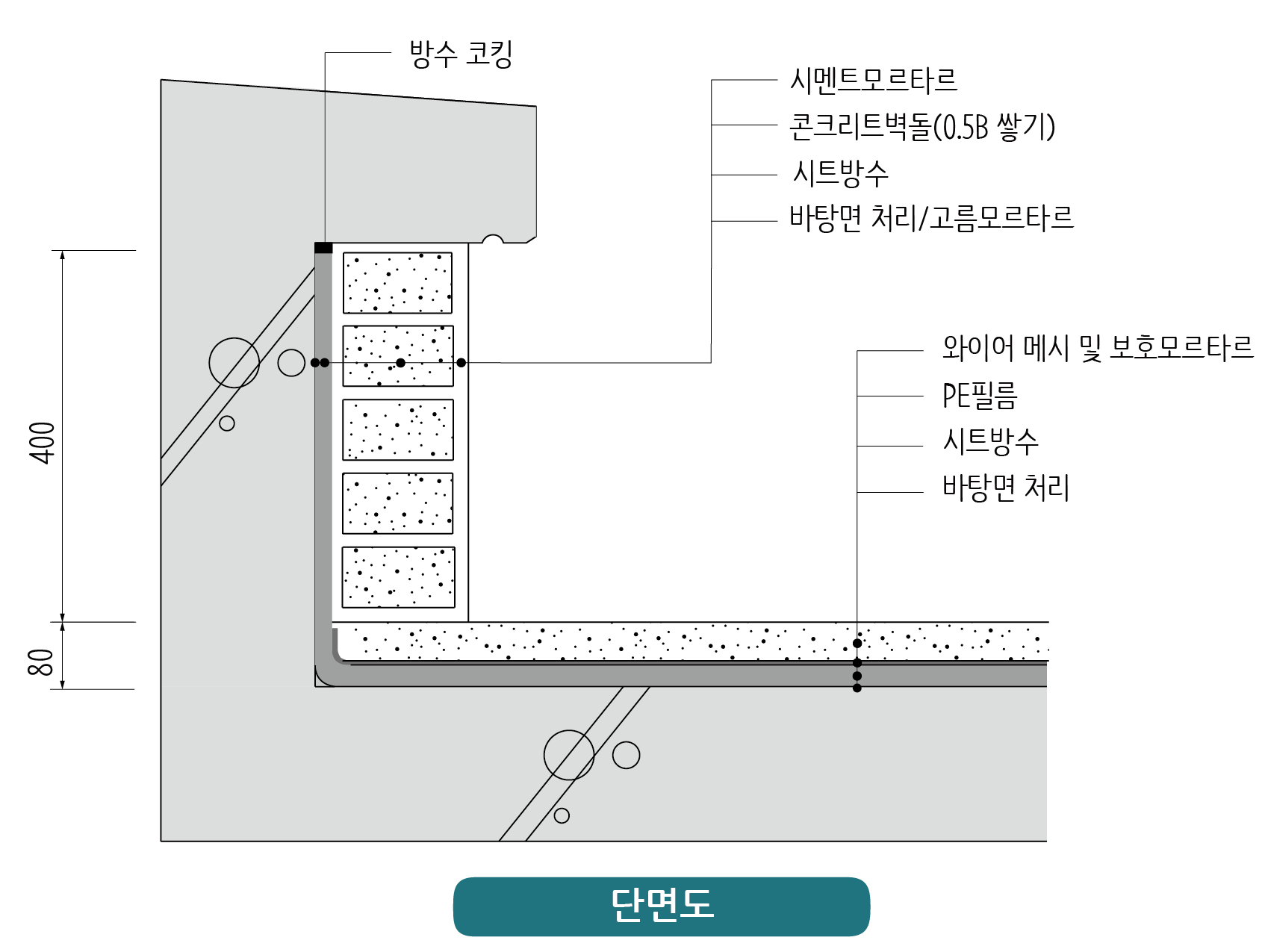 (3) 보호벽돌은 0.5B 쌓기(1m²당 75매)로 400mm 높이를 적용합니다.