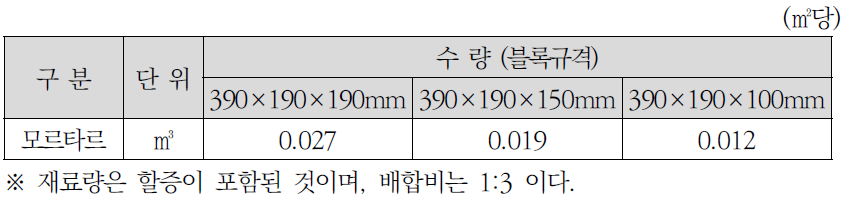 블록공사도 쌓는 데 필요한 부자재인 모르타르, 시멘트와 모래를 별도로 산출해야 합니다. 블록쌓기용 모르타르 수량은 블록의 규격, 두께별로 구분하여 줄눈나비 10mm를 기준으로 m²당 필요한 모르타르 수량을 산출합니다.