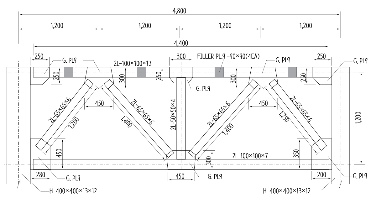 그림을 보면 트러스의 반쪽만 그려져 있기 때문에 주의해야 합니다. 그리고 한 쌍의 트러스에 앵글이 두 개씩 들어가는 것으로 표기되어 있으므로 주의해야 합니다.