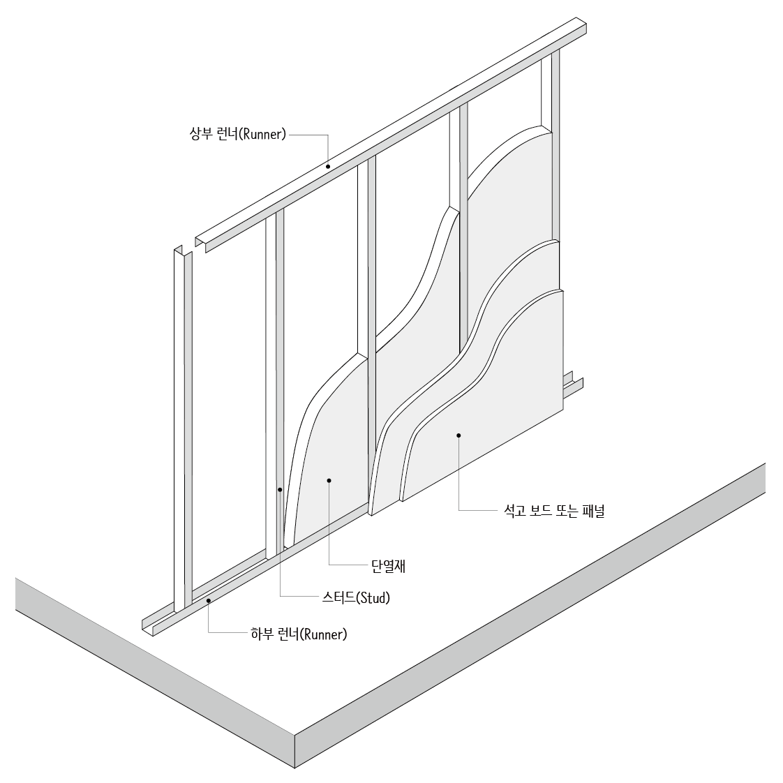 경량 철골 간막이벽은 벽체 위치에 맞추어 벽 틀을 먼저 설치한 후 벽면을 붙이는 방식으로 시공합니다. 벽 틀은 스터드(Stud)라고 하는 수직 부재를 세워서 지지하는데, 러너(Runner)라는 부재를 위아래 슬래브 면에 설치하고 스터드를 고정합니다. 표면을 모르타르나 플라스터로 미장하는 방법도 있지만 보통 패널을 부착하는 건식 방법을 많이 씁니다.