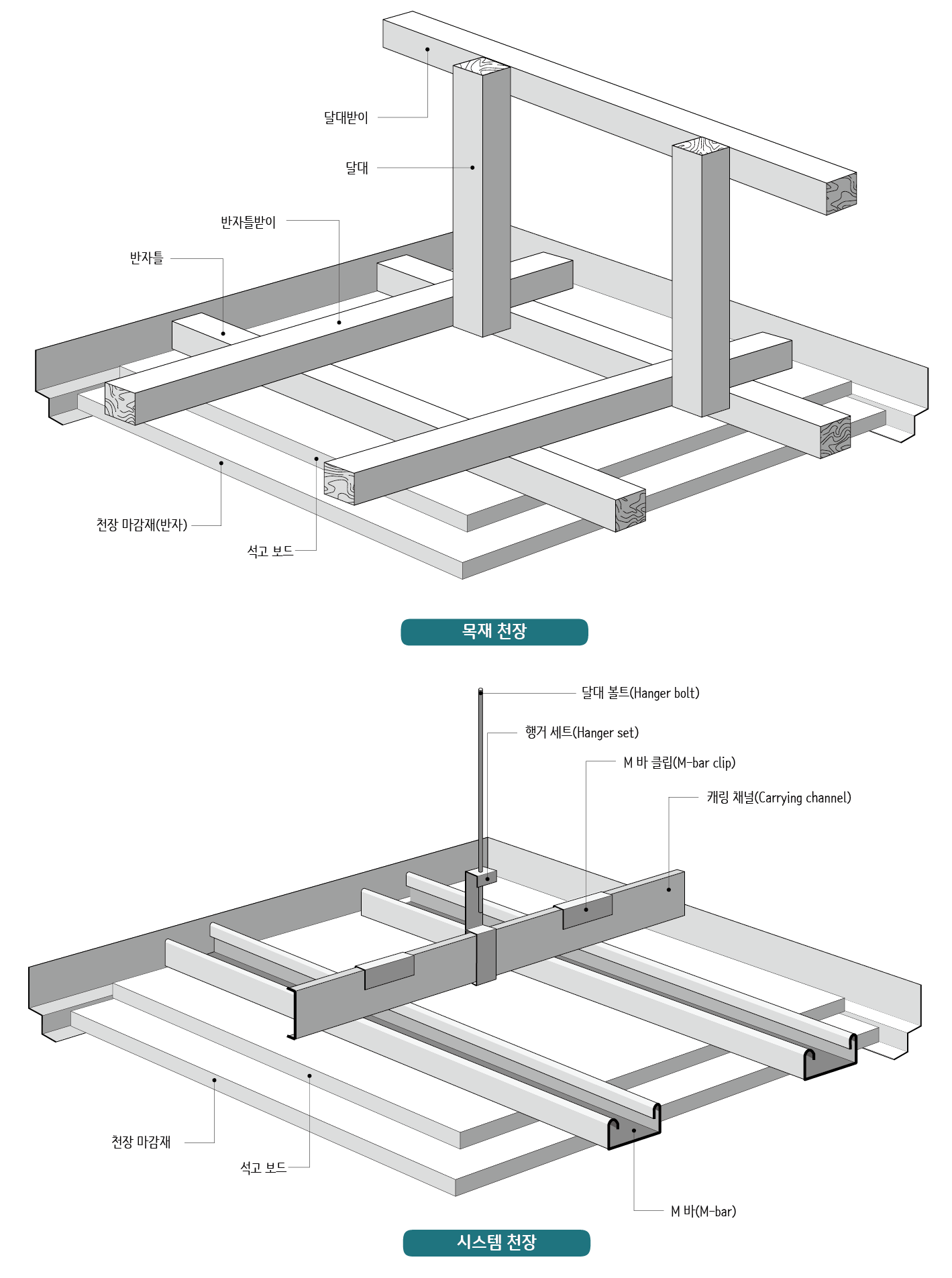 반자에 붙이는 천장재는 용도에 따라 다양하지만 주택이라면 석고보드를 붙인 후 도배지로 마감하는 경우가 많습니다.