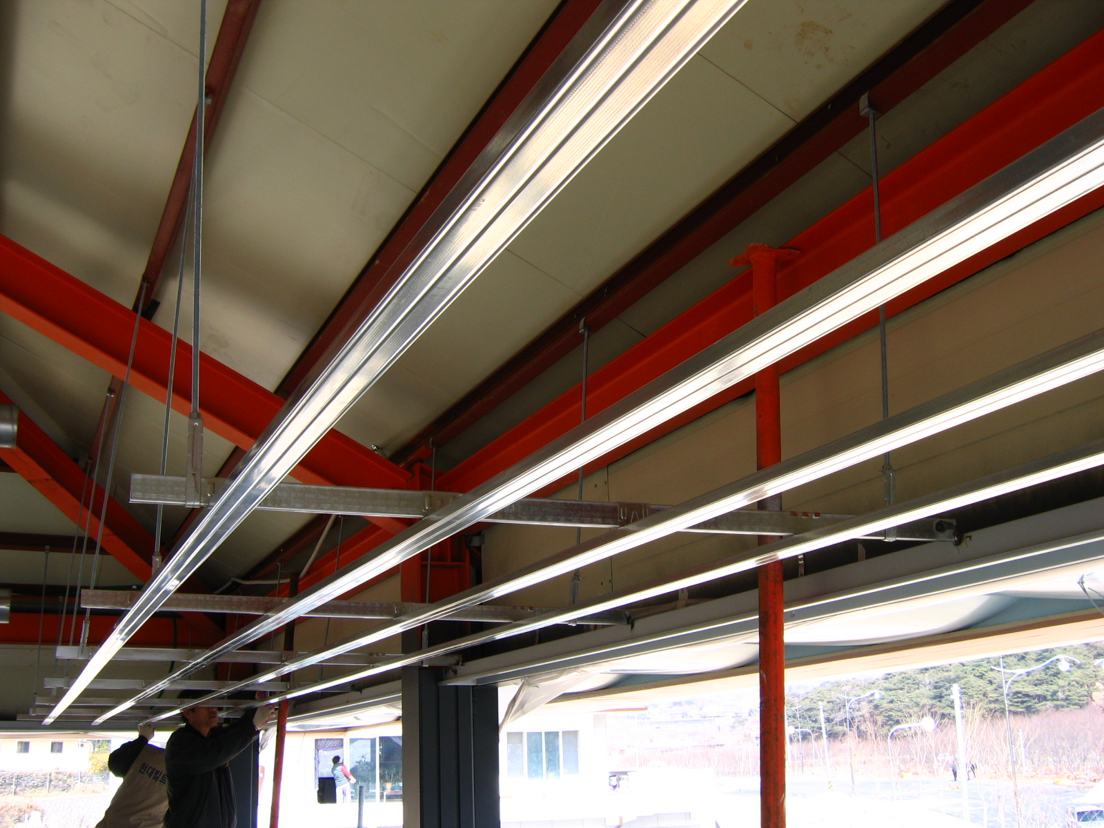 천장은 보통 슬래브 바닥면을 노출하지 않고 이중천장을 설치해서 가리는 방식으로 시공합니다. 이중 천장은 목재로 만들 수도 있고 경량 형강으로 만들 수 있습니다.