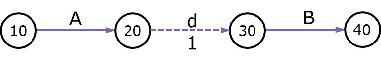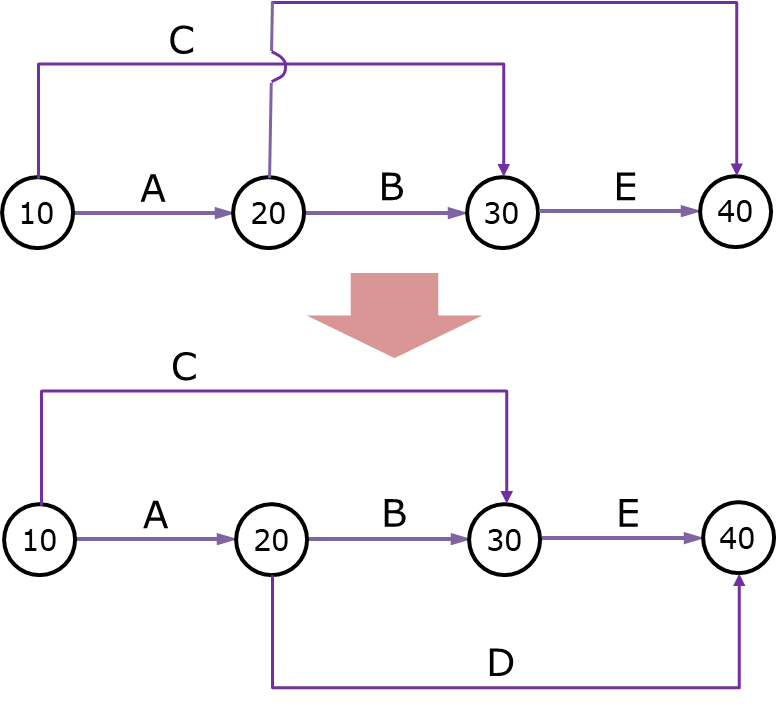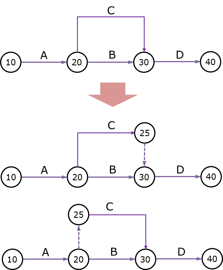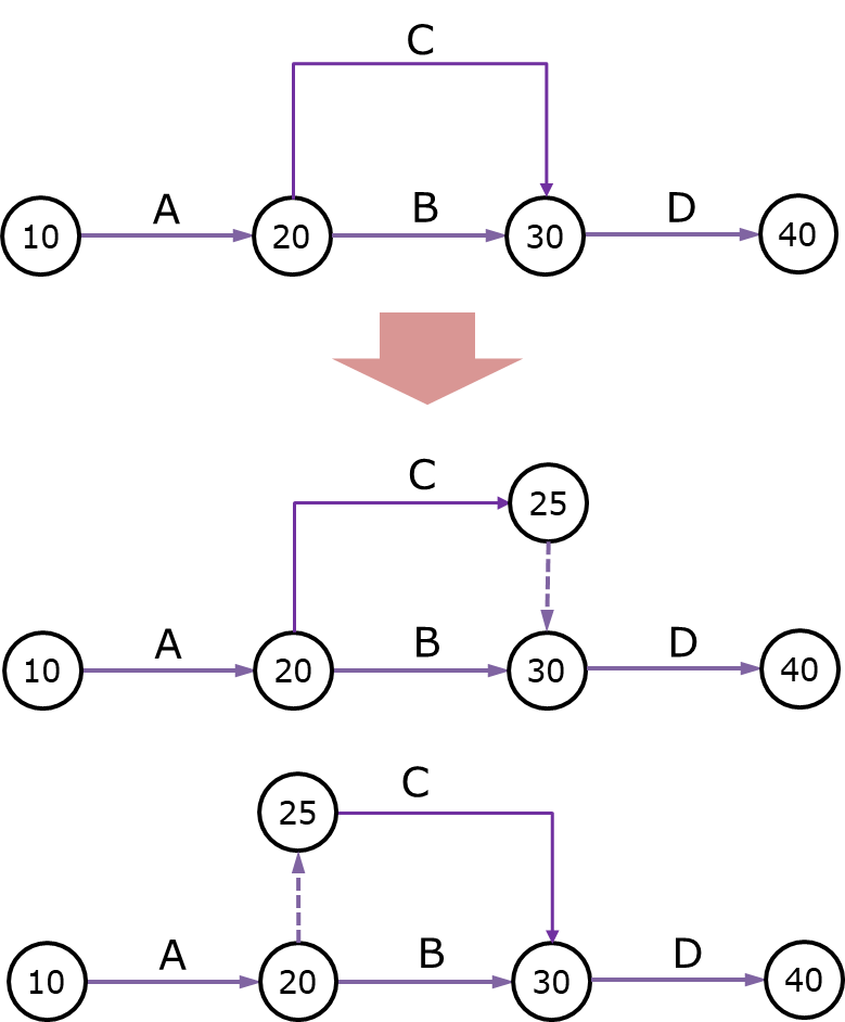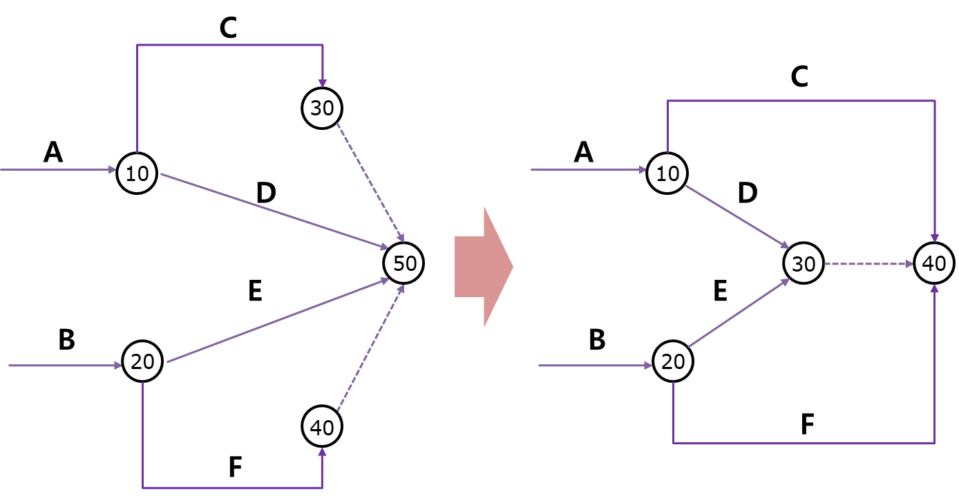 3. 작업원칙 : 모든 작업은 결합점의 고유한 번호로 구분되어야 합니다. 어떤 작업이든 시작점 번호와 종료점 번호가 달라야만 합니다. 즉 고유한 i - j 번호로 구분되어야만 합니다. 아래 그림처럼 절점의 번호를 공유할 경우 더미를 도입해서 구분해야만 합니다.