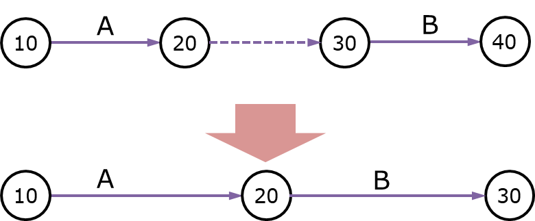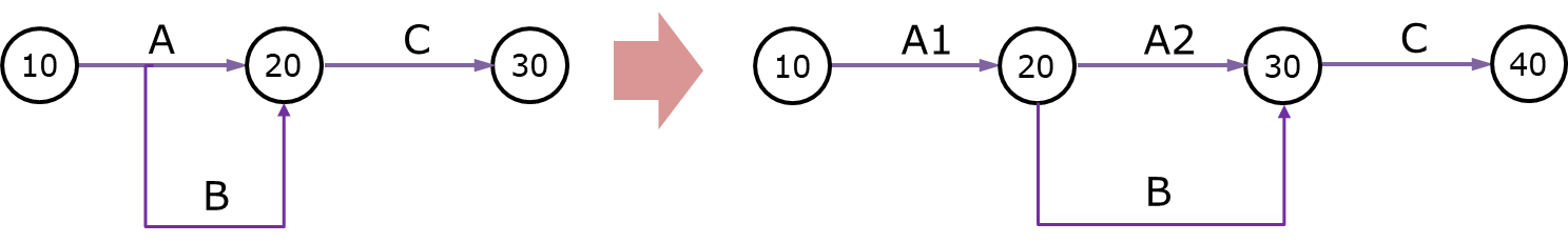 2. 결합점 원칙 : 각 작업은 반드시 시작점과 결합점으로 표시되어야만 합니다. 아래 그림의 왼쪽처럼 A작업의 중간에 B작업이 시작되는 방식으로는 표기할 수 없습니다. 반드시 모든 작업은 결합점에서 시작해서 결합점으로 끝나야 합니다.