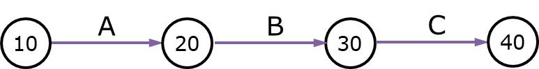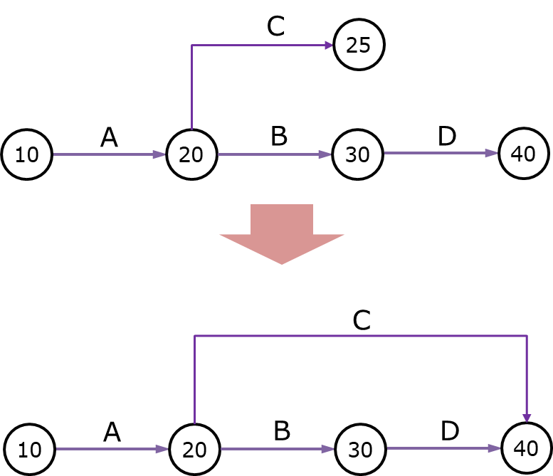 2. 넘버링 더미(numbering dummy) : B작업과 C작업을 동시에 진행할 때 아래와 같이 공정표를 그리면 B와 C는 시작점과 종료점을 공유하게 되고 작업을 구분할 수 없게 됩니다. 이처럼 동시에 진행되는 두 개 이상의 작업의 노드가 중복되는 것을 피하기 위해서는 넘버링 더미가 필요합니다.