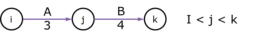 여기서 중요한 것은 각 작업은 고유한 i - j 번호를 가져야만 합니다. 위 그림에서 A작업은 ⓘ에서 시작해서 ⓙ로 끝나고, B작업은 ⓙ에서 시작해서 ⓚ로 끝나는 고유한 번호체계를 갖게 됩니다. A와 B작업은 ⓙ로 연결되는데 A작업은 ⓙ에서 끝나고 B작업은 ⓙ에서 시작하게 됩니다.