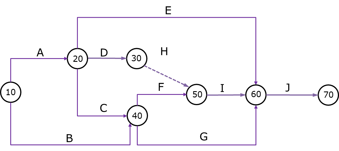 ADM은 작업의 의존관계 중 Finish-to-start 관계만을 표현할 수 있으며, 논리적인 의존관계를 표현하기 위해서 더미작업(Dummy activity)이 필요해집니다. 네트워크 공정표 기법 중 PDM에서 사각형 내부에 표현한 작업을 화살표로 표현하고 PDM의 화살표를 원형의 노드로 바꾸어서 만들어진 것이라고 할 수 있습니다.
