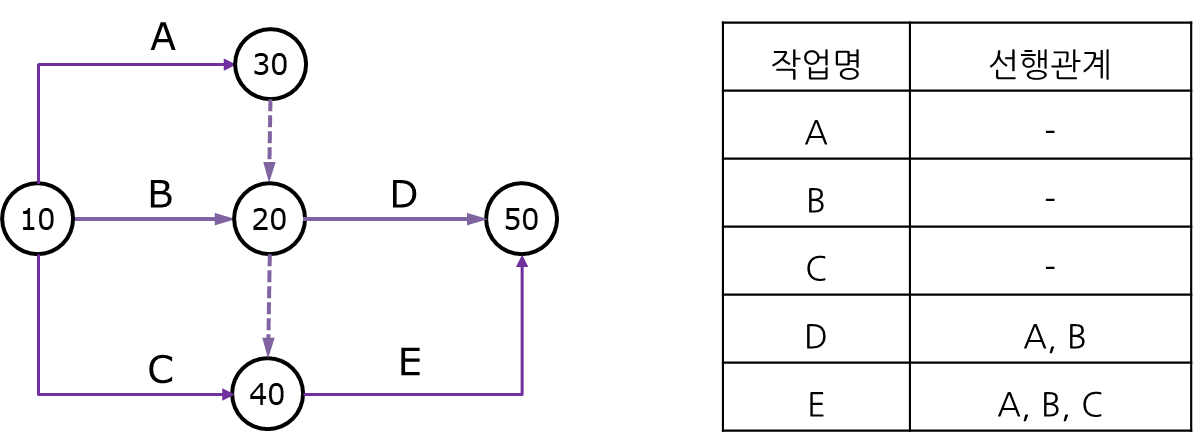 더미는 점선으로 된 화살선으로 표시하고 명목상의 작업이기 때문에 시간이나 자원 등을 포함하지 않습니다.
