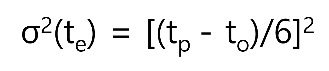 위 표에서 보면 위쪽에 있는 추정치의 경우 비관치와 낙관치의 차이가 크지만, 아래쪽의 경우에는 상대적으로 작습니다. 따라서 개연치인 9일에 완료될 확률이 높다고 할 수 있습니다. 이처럼 각 작업의 소요시간의 불확실성의 정도를 나타내기 위해 분산(Estimated variance of the duration)을 사용하며 분산은 다음과 같이 계산합니다.