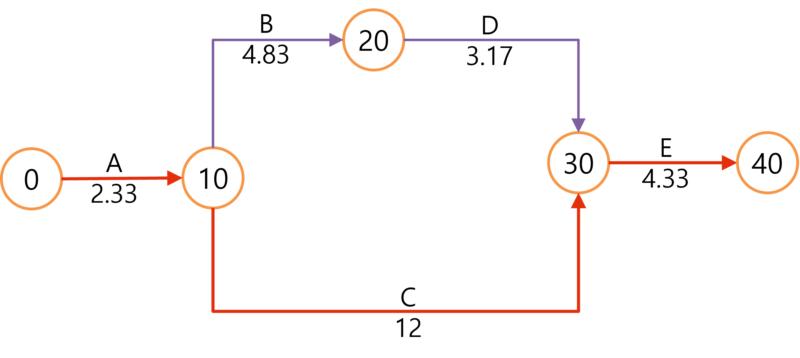 각 작업의 기대값을 바탕으로 CPM 기법으로 전체 소요시간과 주공정선, 여유시간을 산출할 수 있습니다. 주공정선 A-C-E가 되고 총 공기 = 18.7일이 됩니다.