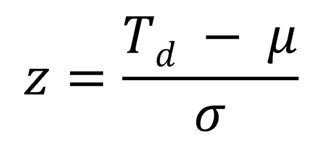 위에서 계산한 평균과 분산을 가지고 정규분포의 Z값을 구하면 다음과 같이 됩니다. Td는 목표 공기이므로 16입니다