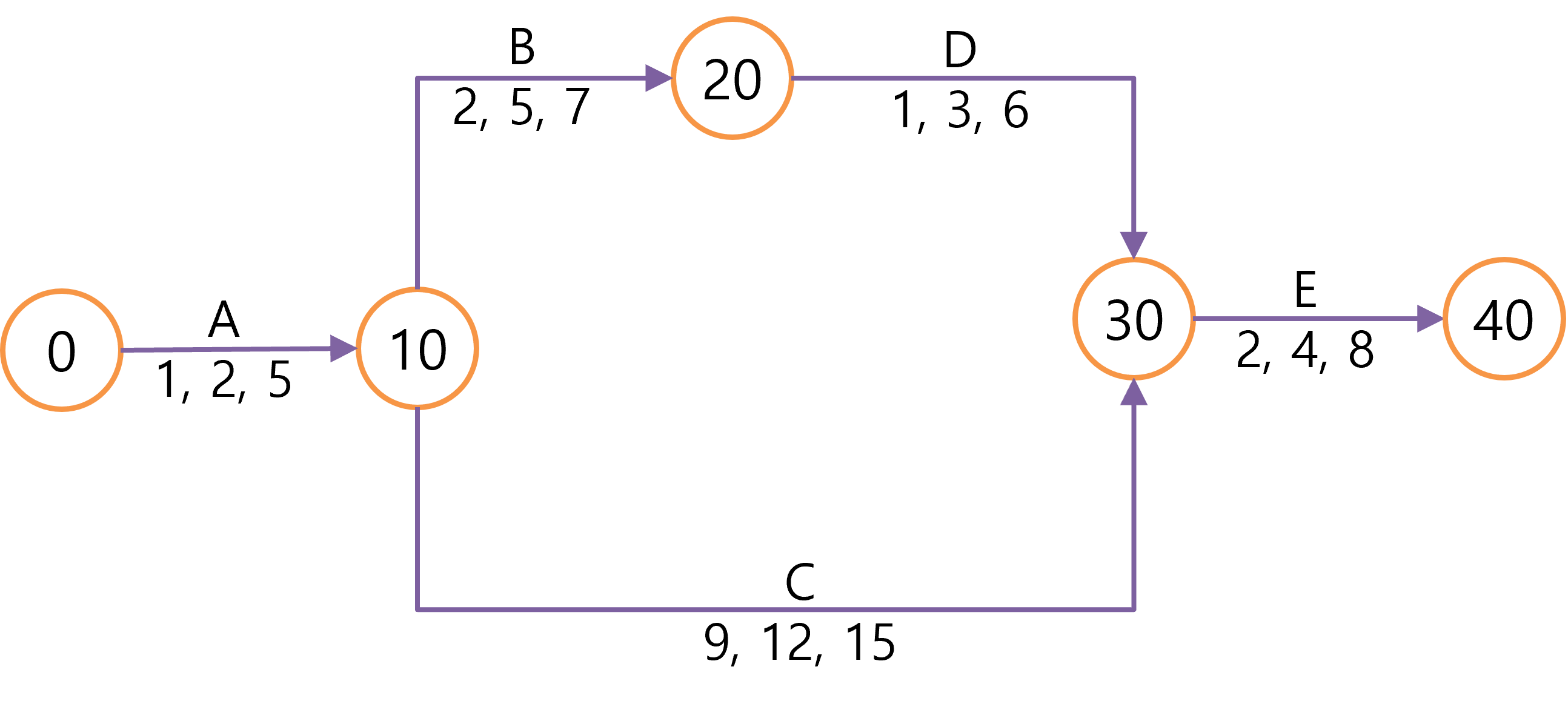 PERT에서는 기대값과 함께 분산도 사용합니다. 예를 들어 3가지 기대값이 다음과 같다고 가정하겠습니다.