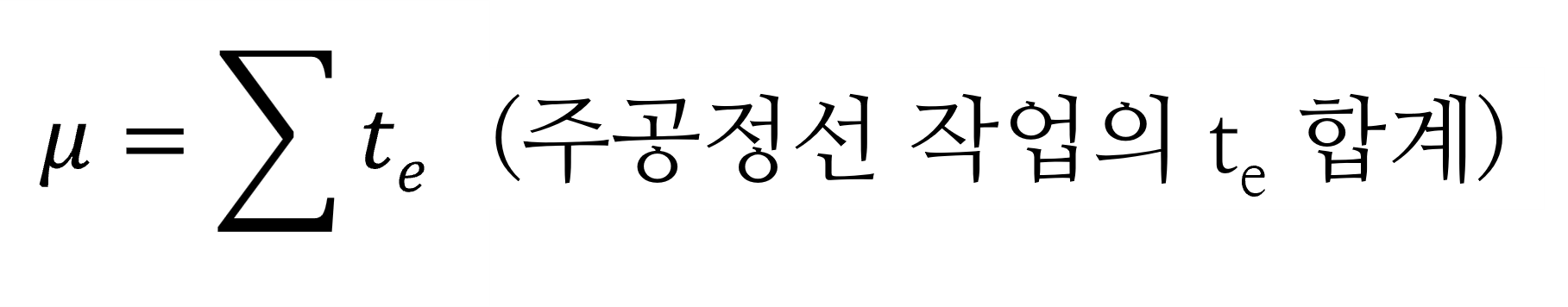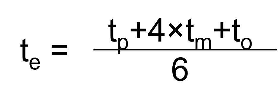 그런데 주공정선(CP)를 결정하고 전체 공기를 계산하기 위해서는 각 작업마다 하나의 값으로 계산해야만 합니다. 이렇게 3가지 추정값으로는 CPM을 이용하여 프로젝트의 전체 소요시간을 분석할 수 없기 때문에 개별 작업의 기대값(Expected duration of activity)을 계산해야만 합니다. 이 때 개별작업의 기대값은 다음과 같이 계산합니다.