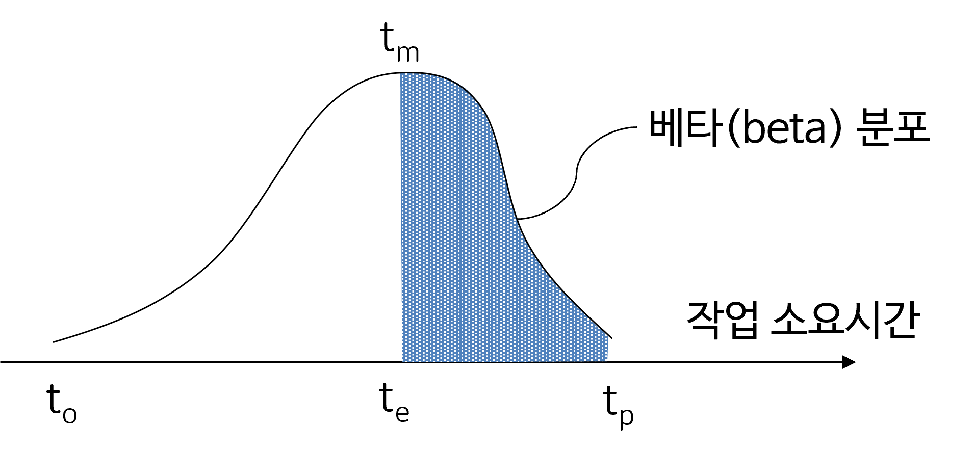 이 때 8일은 개연시간치가 되고, 5일은 낙관시간치, 17일은 비관시간치가 됩니다. 이 때 작업기간은 세 가지 추정치로 기반으로 베타분포를 따른다고 가정합니다.