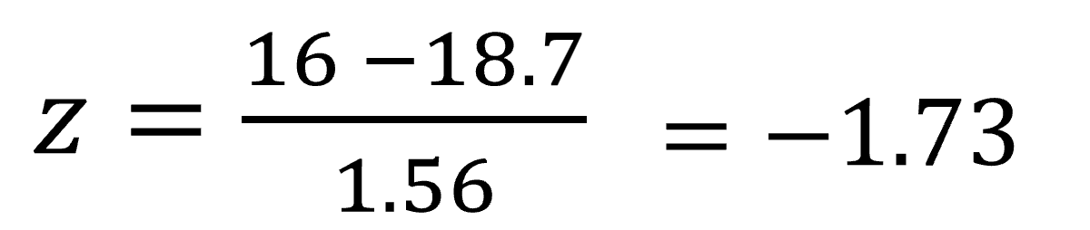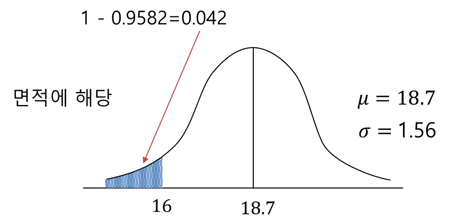 자 그럼 위 프로젝트를 16일 이전에 끝낼 수 있는 확률은 어떻게 될까요? 평균이 18.7이고 분산이 1.56이니 확률이 작을 것이라고 예상할 수 있습니다.