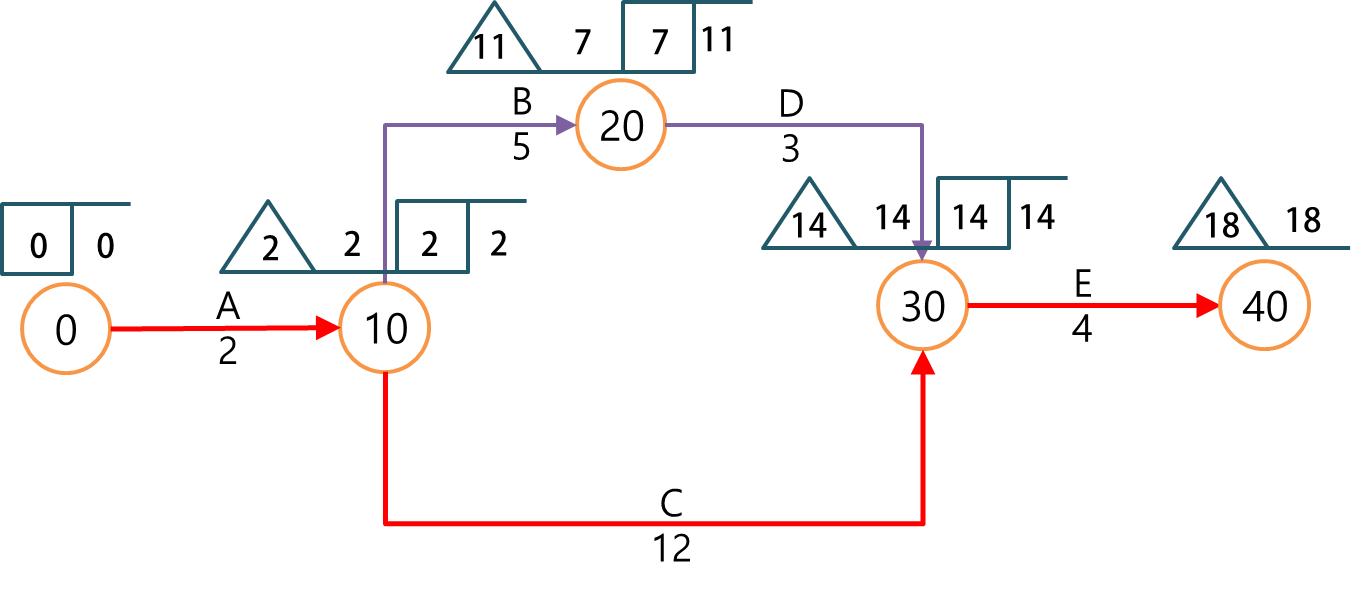 일정의 계산은 CPM과 마찬가지로 전진계산법에 의해 절점의 EFT와 EST를 구하고 후진계산법으로 절점의 LST와 LFT를 구합니다.