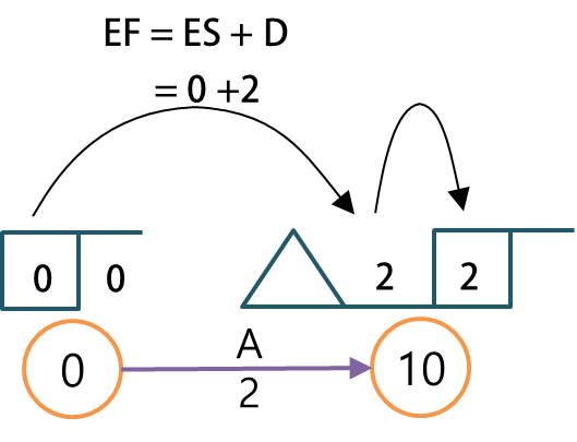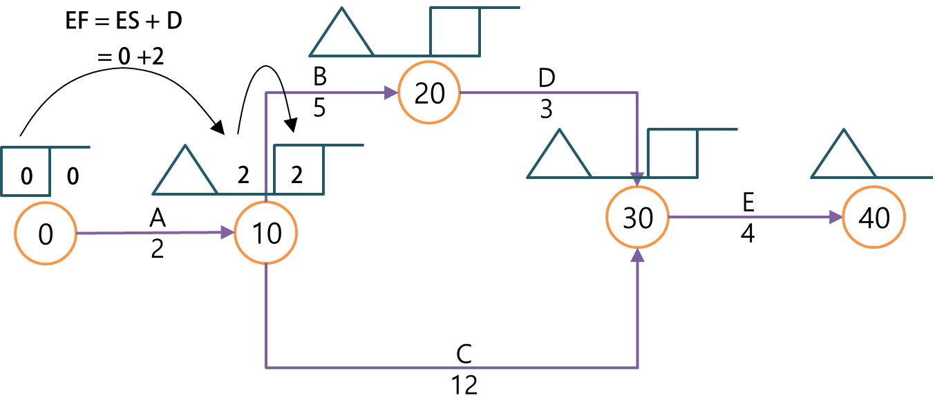 맨 처음 시작하는 A작업의 ES는 0으로 시작하고 각 절의 EF는 ES에 작업기간(d)를 더해서 계산합니다.