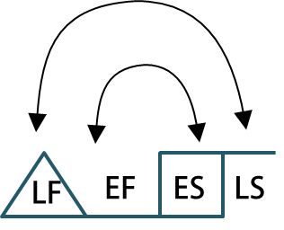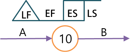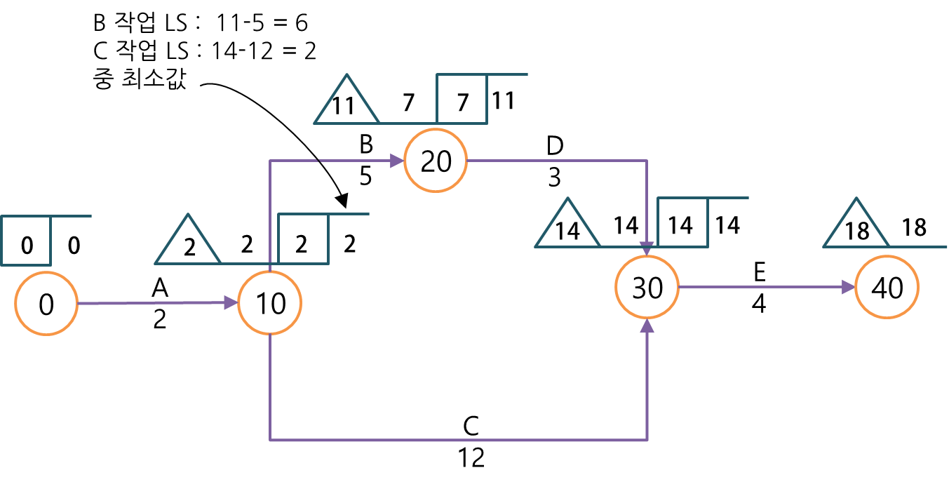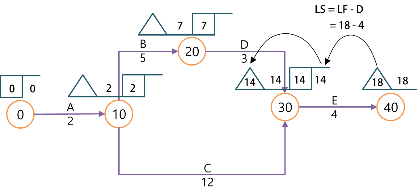 아래 그림과 같은 방식으로 오른쪽에서 왼쪽으로 후진계산을 하면서 각 절점의 LS는 LF에서 작업기간을 뺀 값으로 적용합니다.