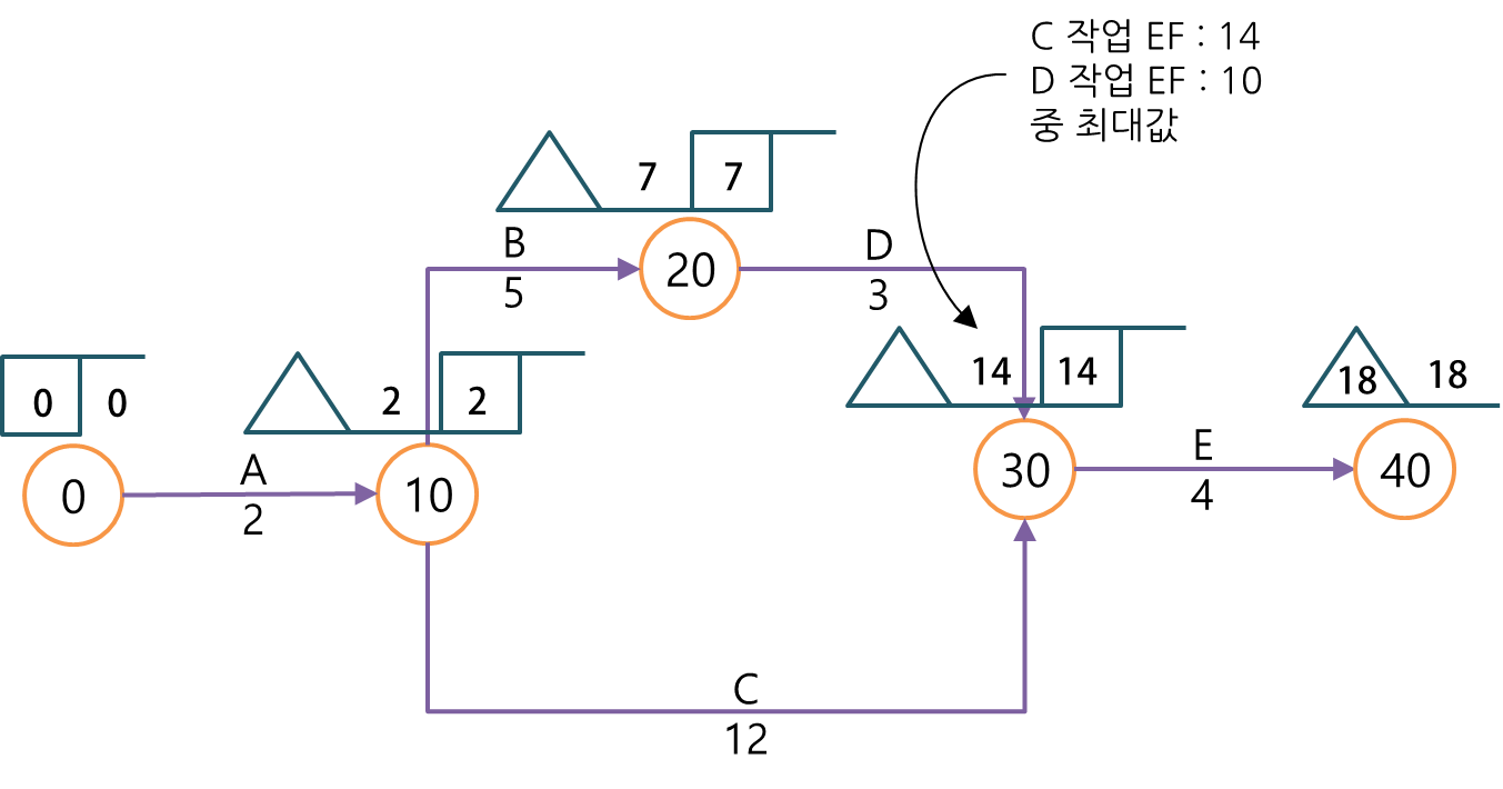 E작업의 시작점은 D작업과 C작업이 모두 완료되어야만 개시할 수 있습니다. 따라서 가장 오래 걸린 시작만큼 기다려야만 합니다. 이처럼 2가지 이상의 작업이 병합되는 작업은 이전 작업의 EF 중 가장 큰 값을 적용합니다.