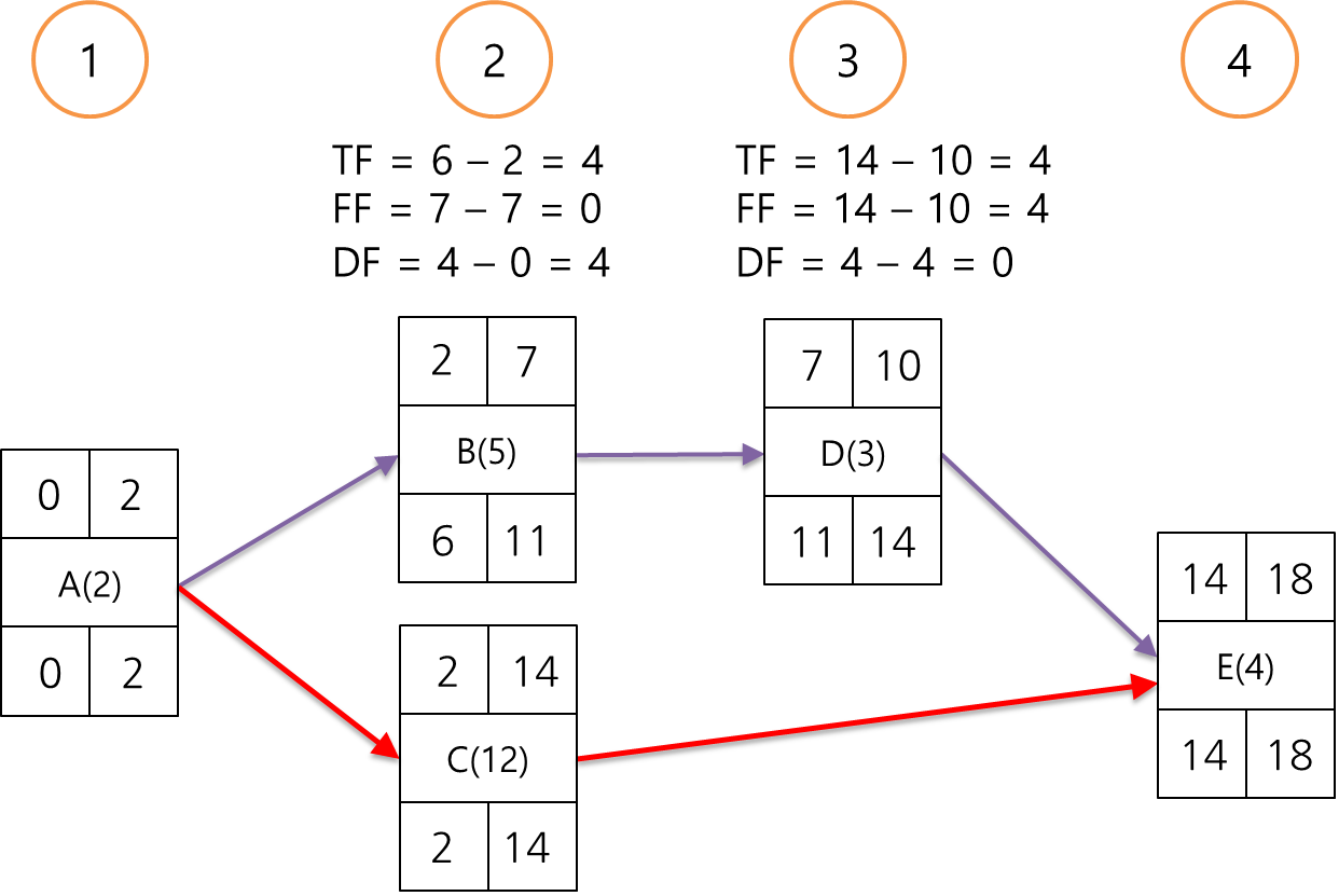 PDM 일정계산에서 다음 예제를 가지고 일정을 작성했습니다. 그럼 주공정선이 아닌 작업의 여유시간은 어떻게 계산할 수 있을까요?