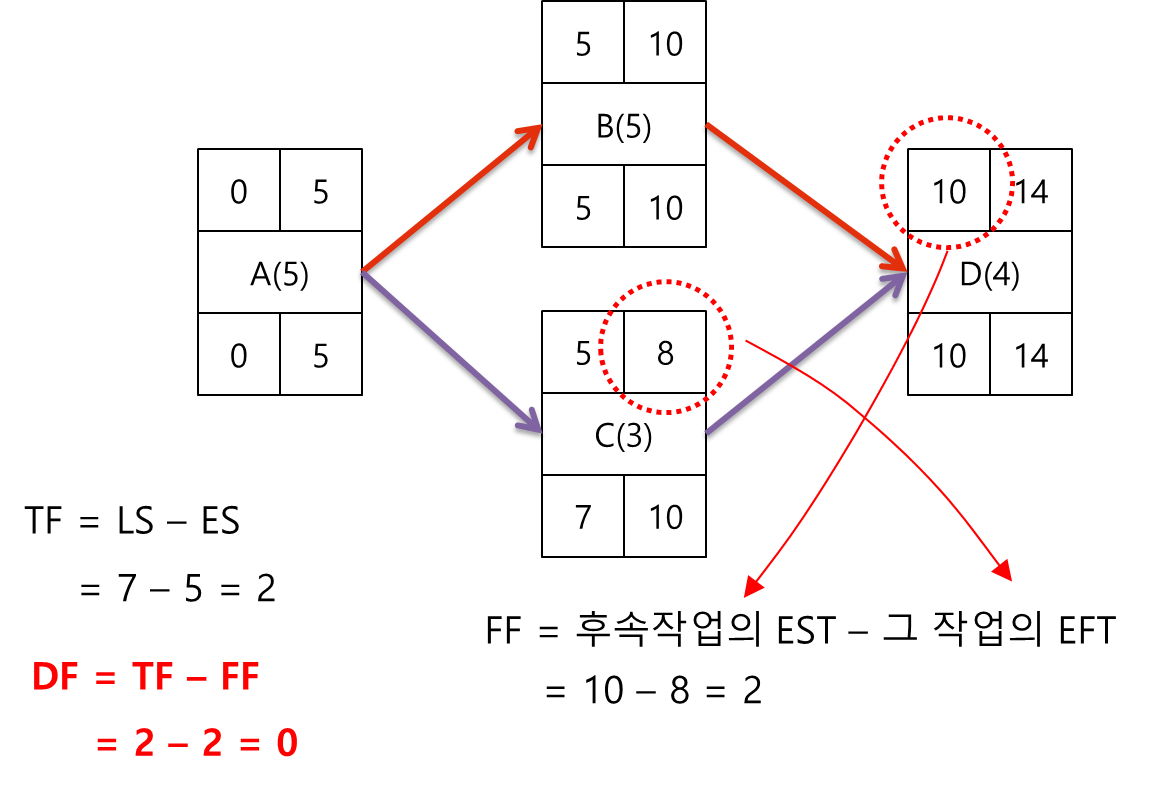 자유 여유시간은 다음과 같이 구할 수 있습니다. 자유여유는 후속작업의 EST에 영향을 주지 않아야 하므로 후속작업의 EST에서 그 작업의 EFT값을 빼는 방식으로 계산합니다.