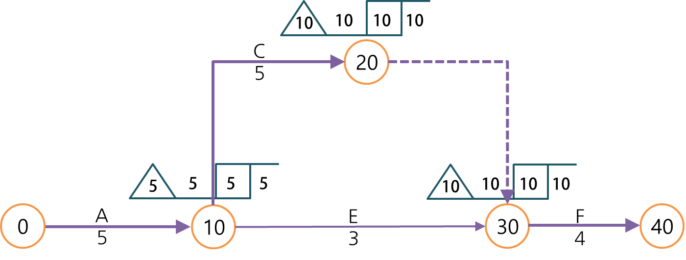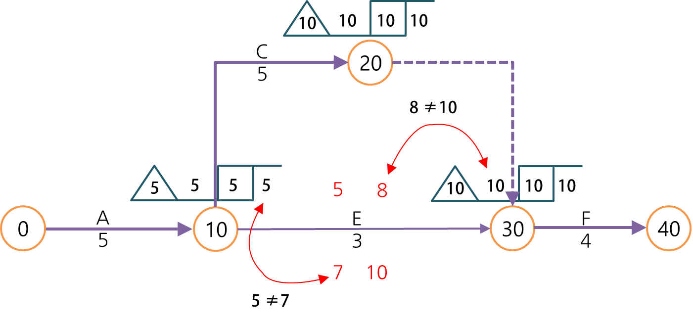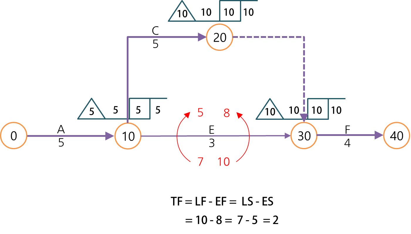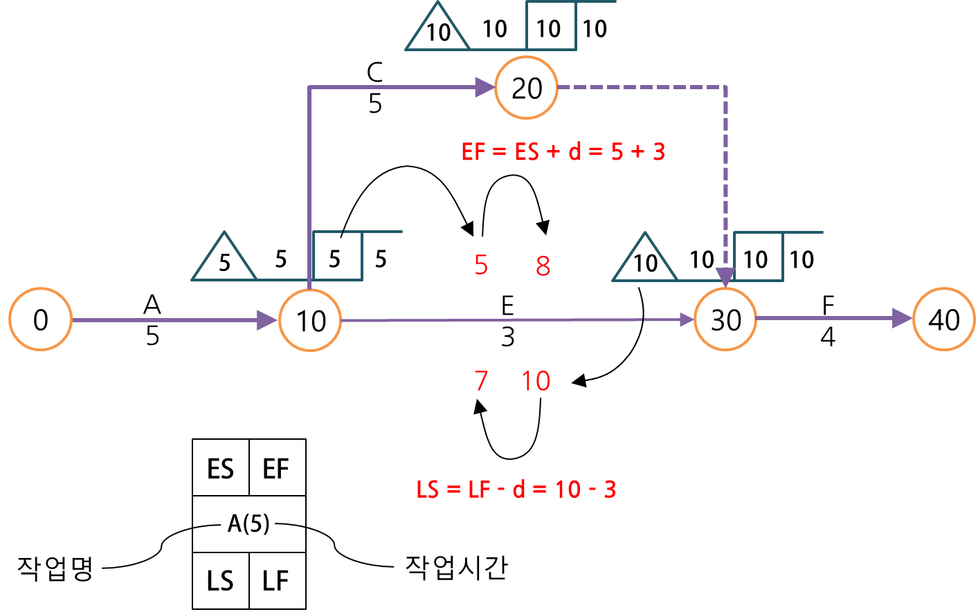 즉 그 작업의 EF는 ES에서 작업시간을 더해서(EF = ES + d) 값을 계산해야 하고, 도형으로 나타낸다면 절점의 삼각형 값에서 절점의 네모상자 값과 작업기간을 빼는 식으로 계산할 수 있습니다.