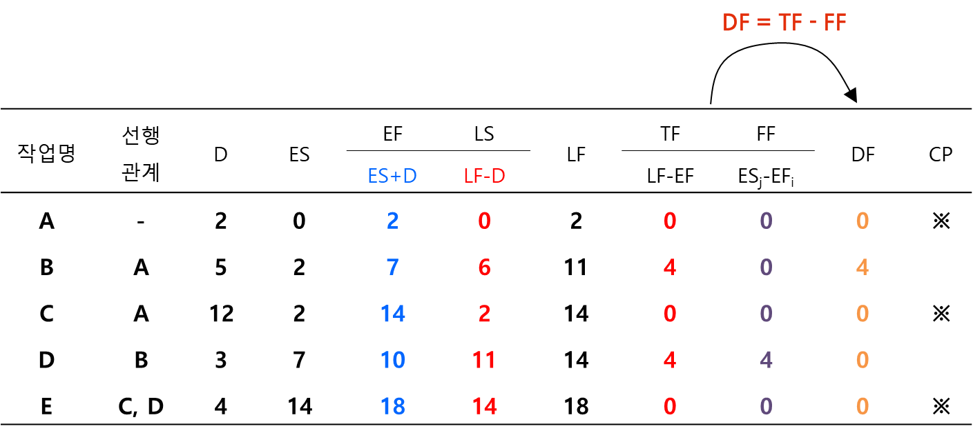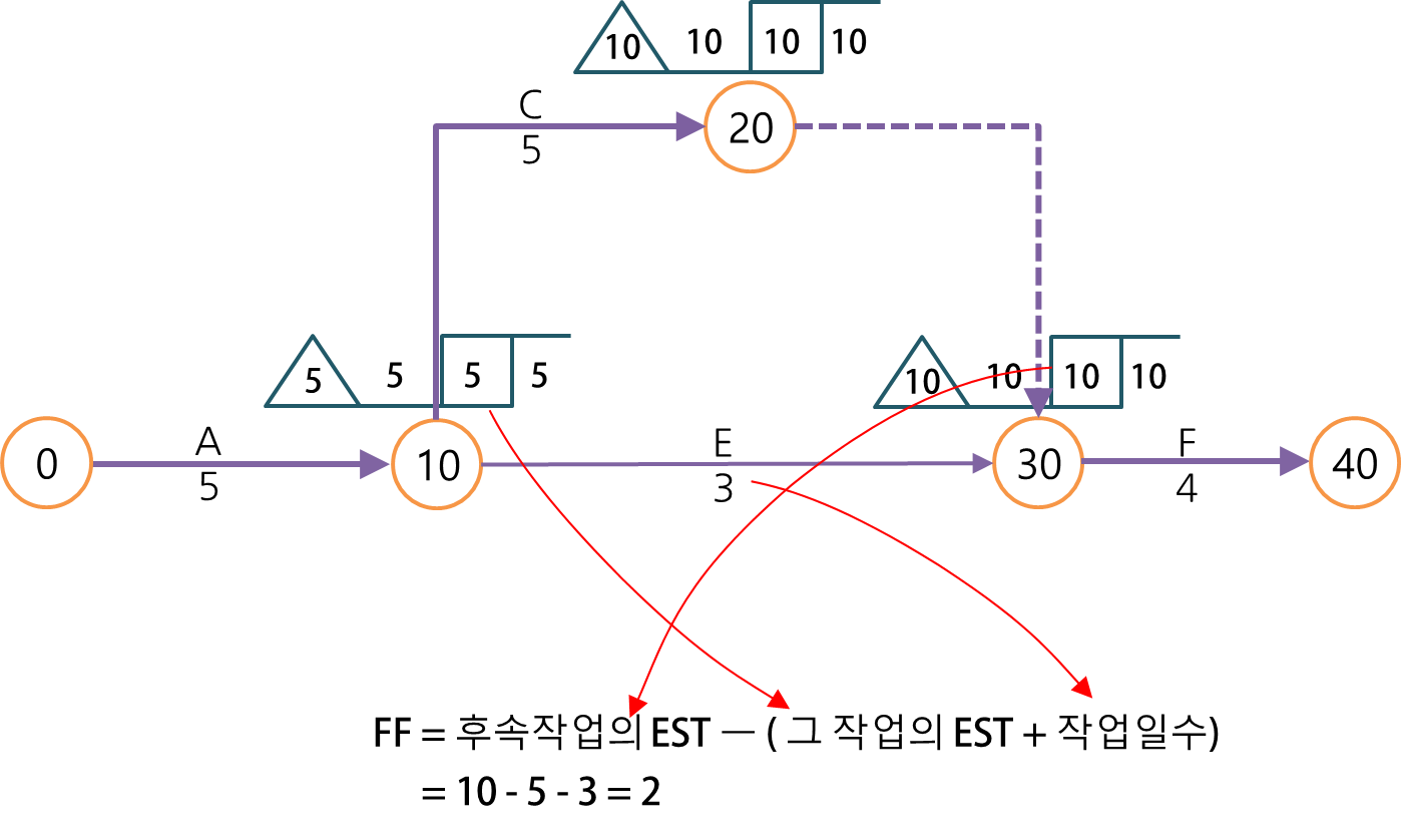 그 다음 FF를 구하는데 이 값은 후속작업의 ES를 필요로 하므로 공정표를 보고 후속작업의 ES에서 그 작업의 EF값을 빼서 구합니다.