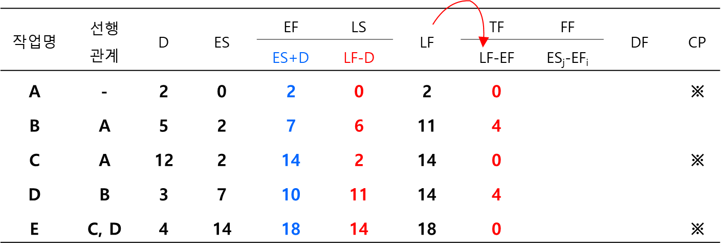 작 작업의 TF는 LF에서 EF를 뺀 값으로 계산합니다