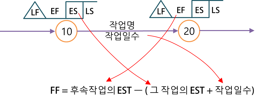 FF는 다음과 같이 후속작업의 ES에서 그 작업의 EF를 뺀 값으로 계산합니다.