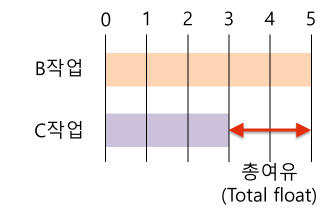 주공정선에 해당하는 작업은 여유가 없지만, 주공정선에 해당하지 않는 C작업은 여유가 있습니다. 다른 식으로 표현하면 EFT와 LFT가 같을 때는작업(Activity)의 여유가 없지만, EST와 LST가 다르거나 EFT와 LFT가 다른 경우 작업에 여유가 있습니다. 이 여유 시간을 플로트(Float)라고 합니다.