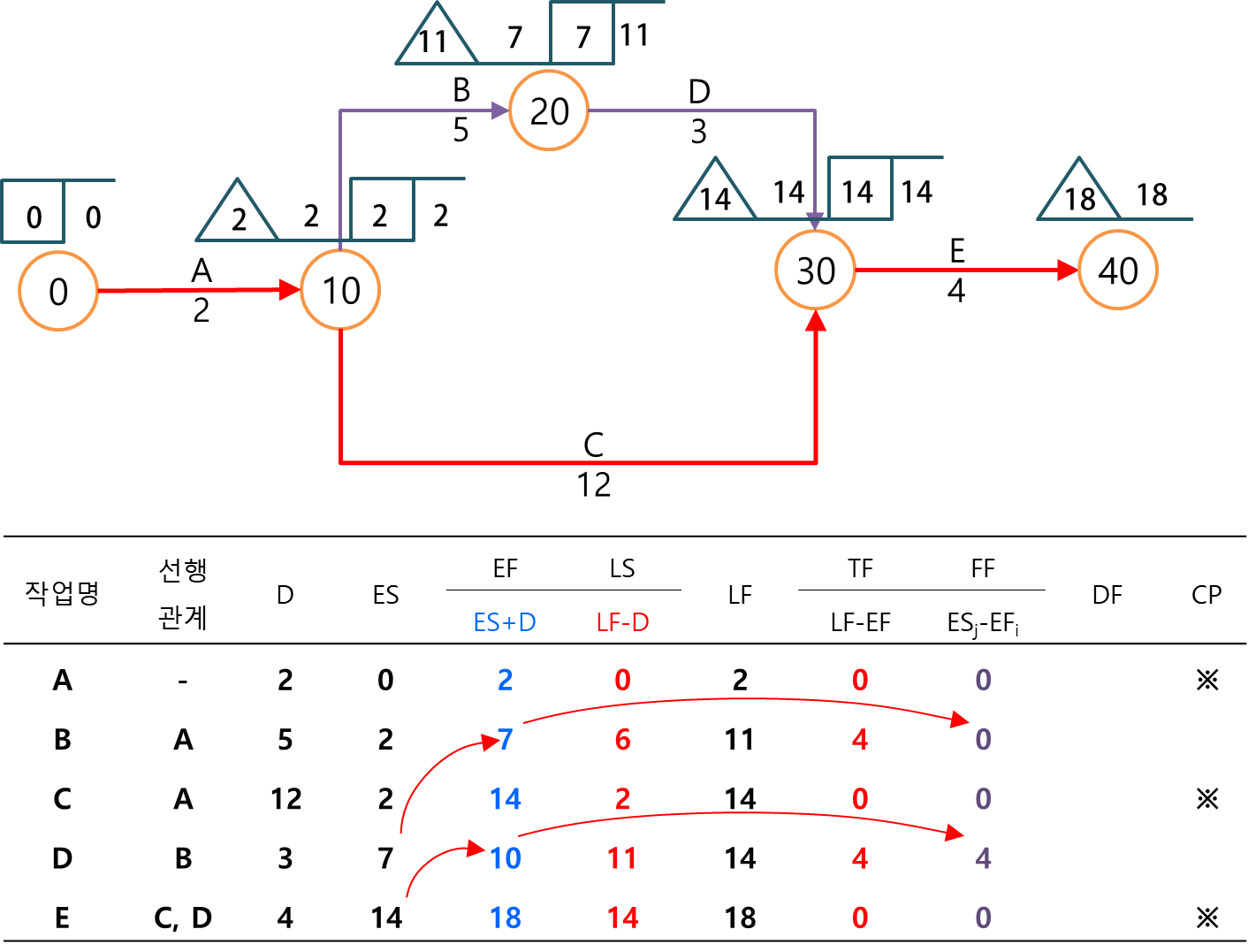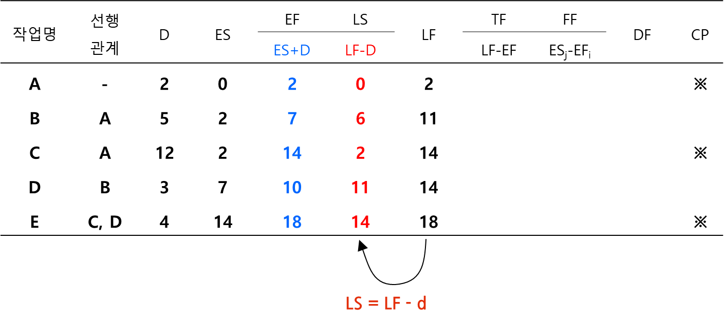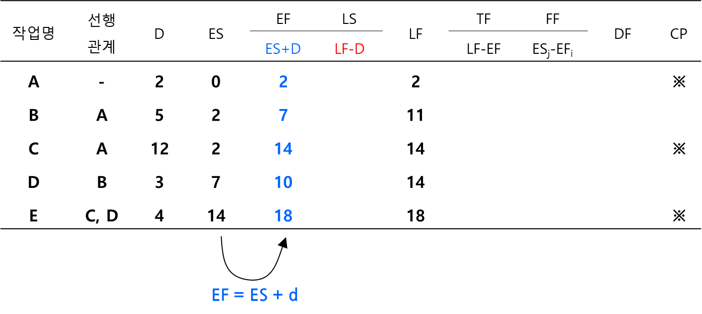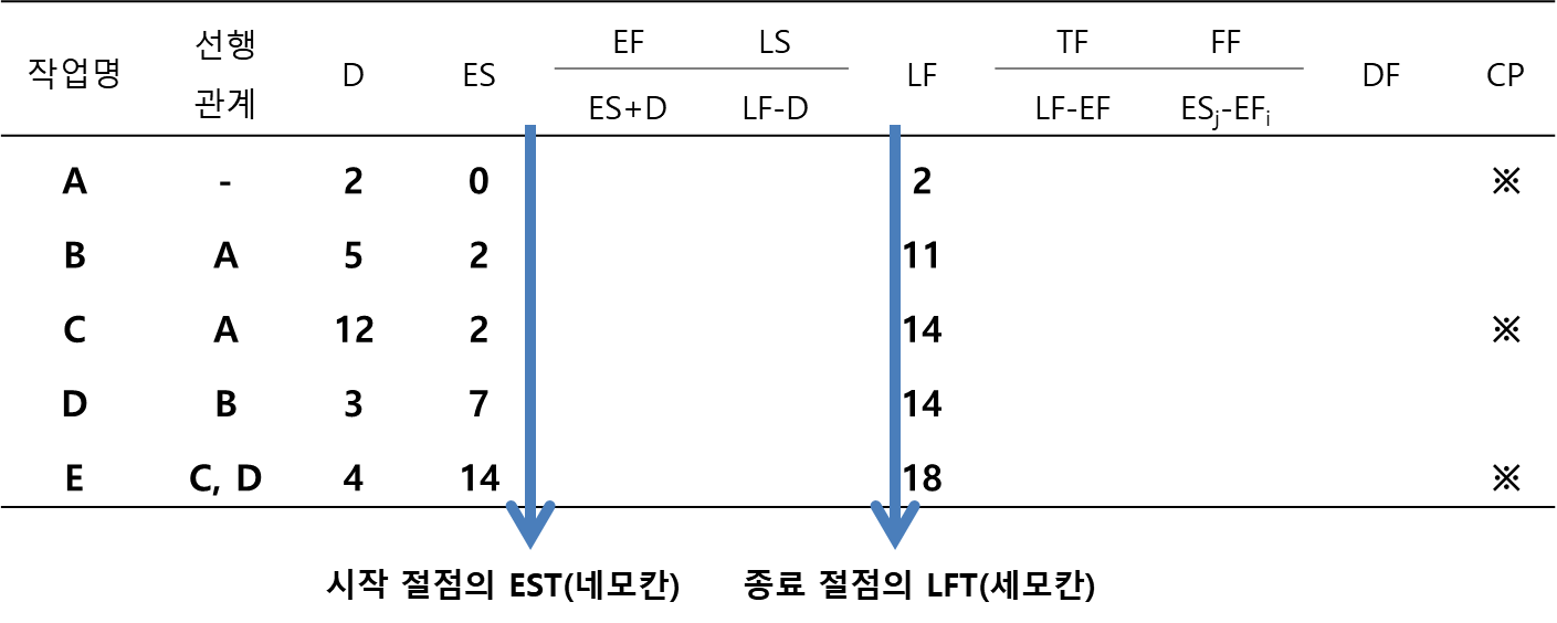 표로 정리해서 계산한다면 다음과 같이 먼저 각 작업의 ES와 LF를 기록합니다. 이 값은 절점의 네모와 세모에 있는 값에 해당합니다.
